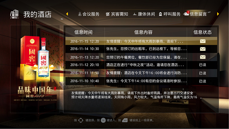 快速退房服務(wù):酒店高效率服務(wù)無(wú)不受到顧客稱贊,用戶在客房按下退房開(kāi)關(guān)時(shí)直接可以辦理退房手續(xù),通知服務(wù)人員對(duì)客房進(jìn)行檢查,結(jié)束后打印帳單,用戶下樓買(mǎi)單離去,期間無(wú)需排隊(duì)等待。
