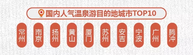 用戶比較青睞前往哪些目的地進(jìn)行溫泉游?國內(nèi)方向,以江蘇、安徽、浙江以及云南為主,人氣目的地前十名分別為常州、南京、揚(yáng)州、黃山、廈門、蘇州、安吉、寧波、廣州、騰沖,人氣較高的溫泉(度假區(qū))有天目湖御水溫泉、南京湯山溫泉、常州恐龍谷溫泉、揚(yáng)州瘦西湖溫泉度假村、黃山醉溫泉度假酒店、廈門日月谷溫泉度假村、廣州碧水灣溫泉度假村、蘇州四季悅溫泉、安吉江南天池溫泉、騰沖火山熱海溫泉。