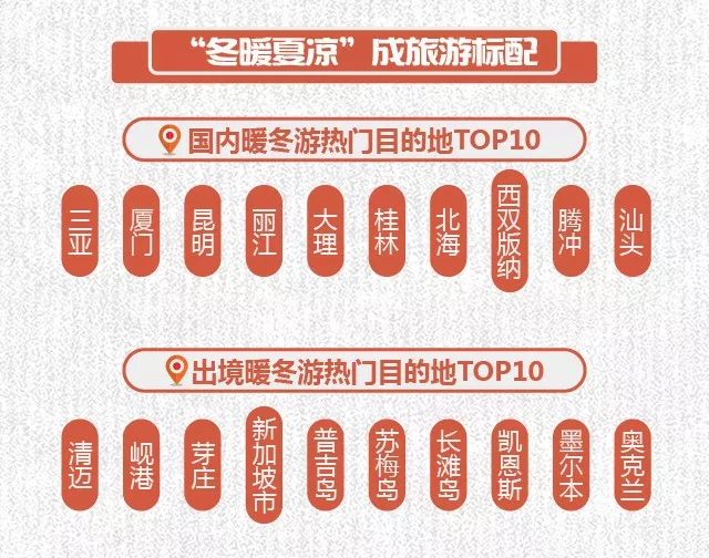 隨著交通運(yùn)力的不斷提升,國內(nèi)游客開始有條件像“候鳥”一般,在冬季來一場過冬“大遷徙”。值得一提的是,在琳瑯滿目的暖冬游產(chǎn)品中,線路是否具有養(yǎng)生特點(diǎn),除了溫暖的氣候條件外,還需輔以充沛的日照、水文資源,以及動靜相宜的玩法。綜合來看,全國范圍暖冬養(yǎng)生游目的地主要集中在三亞、廈門、昆明、麗江、大理、桂林、北海、西雙版納、騰沖、汕頭等地;出境方向主要集中在東南亞的清邁、峴港、芽莊、新加坡市,熱帶海島如普吉島、蘇梅島、長灘島,以及長線游如澳洲的凱恩斯、墨爾本、奧克蘭等目的地城市。
