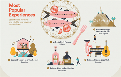 2018年最受歡迎的體驗預(yù)計在里斯本,旅客可以在那里感受最純正的當(dāng)?shù)仫L(fēng)味。其他熱門體驗包括登頂洛杉磯的好萊塢地標、解秘倫敦的隱藏爵士樂俱樂部或秘密樹屋、探索紐約的“禁酒令時代(1920年–1933年)”。