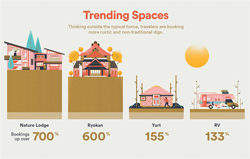 大多數(shù)旅客都在尋找具有典型特色的民宿或公寓,而其他類型的住宿形態(tài)也越來越受歡迎。2017年數(shù)據(jù)表明,山林小屋的預(yù)訂量上漲了700%,房車的預(yù)訂量上漲了133%。