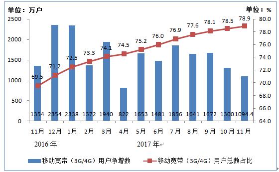 圖3 2016-2017年11月移動(dòng)寬帶用戶當(dāng)月凈增數(shù)和總數(shù)占比情況