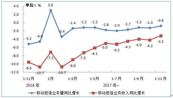 圖7 2016-2017年11月移動(dòng)短信業(yè)務(wù)量和收入同比增長(zhǎng)情況