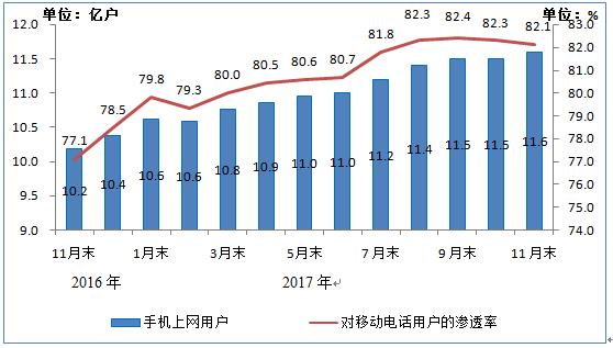 圖5 2016-2017年11月手機(jī)上網(wǎng)用戶和對(duì)移動(dòng)電話用戶滲透率情況