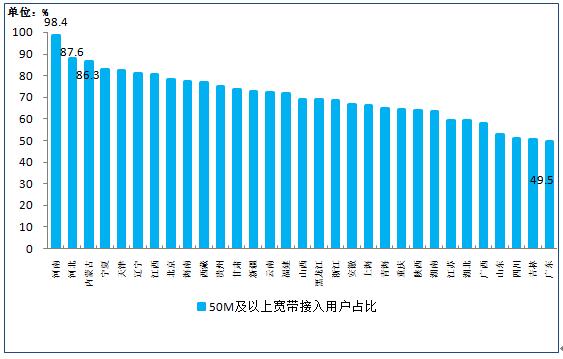 11月末,東、中、西部地區(qū)50M及以上寬帶接入用戶分別達(dá)到11314萬(wàn)戶、6585萬(wàn)戶和5249萬(wàn)戶,用戶滲透率中部地區(qū)領(lǐng)先,達(dá)到73.5%,東部、中部地區(qū)分別為64.6%和64.4%。各省50M及以上寬帶接入用戶占比差異呈縮小態(tài)勢(shì),河南、河北和內(nèi)蒙古分別居全國(guó)前三位,占比均超過(guò)85%。