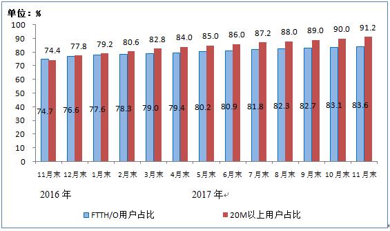 圖4 2016-2017年11月光纖接入(FTTH/O)和20Mbps及以上固定寬帶接入用戶占比情況