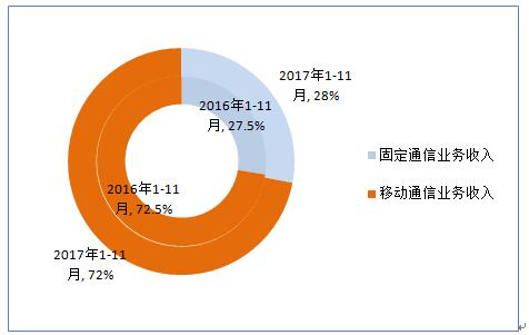 圖2 2017年1-11月電信業(yè)務(wù)收入結(jié)構(gòu)占比情況(固定和移動(dòng))