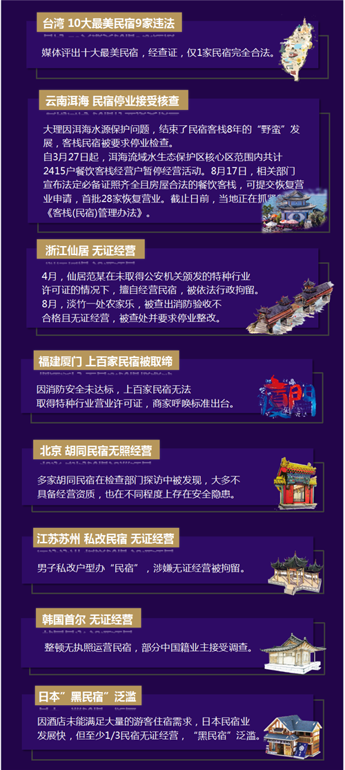 民宿業(yè)從“摸石頭過河”轉(zhuǎn)為“有規(guī)可循”的經(jīng)營管理狀態(tài),仍會出現(xiàn)“適應(yīng)不良”的問題。2017年,有多家民宿因無證經(jīng)營、消防驗收不合格、將商品房私改民宿等被相關(guān)部門查處并要求停業(yè)整治。