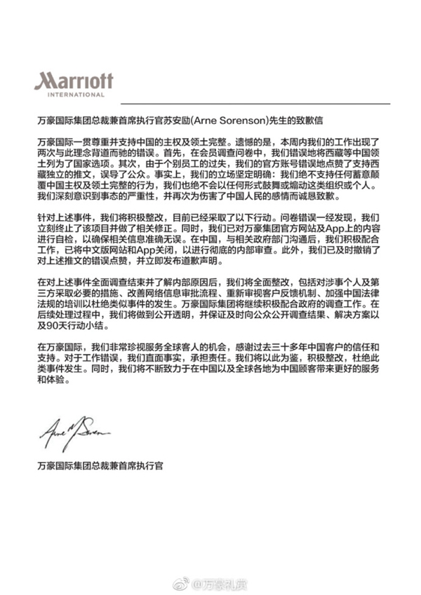 1月12日凌晨,萬豪國際集團(tuán)微博賬號“萬豪禮賞”發(fā)布該集團(tuán)總裁兼CEO蘇安勵的致歉信。致歉信中稱,“由于個別員工的過失,我們的官方賬號錯誤地點(diǎn)贊了支持‘西藏獨(dú)立’的推文,誤導(dǎo)了公眾?!?/p>