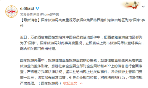 近日,萬豪國際集團(tuán)在發(fā)給其中國會員的活動郵件中,把西藏和港澳臺地區(qū)都列為了“國家”。國家旅游局對此事高度重視,立即責(zé)成上海市旅游局盡快查明事實(shí),配合相關(guān)部門做出處理。